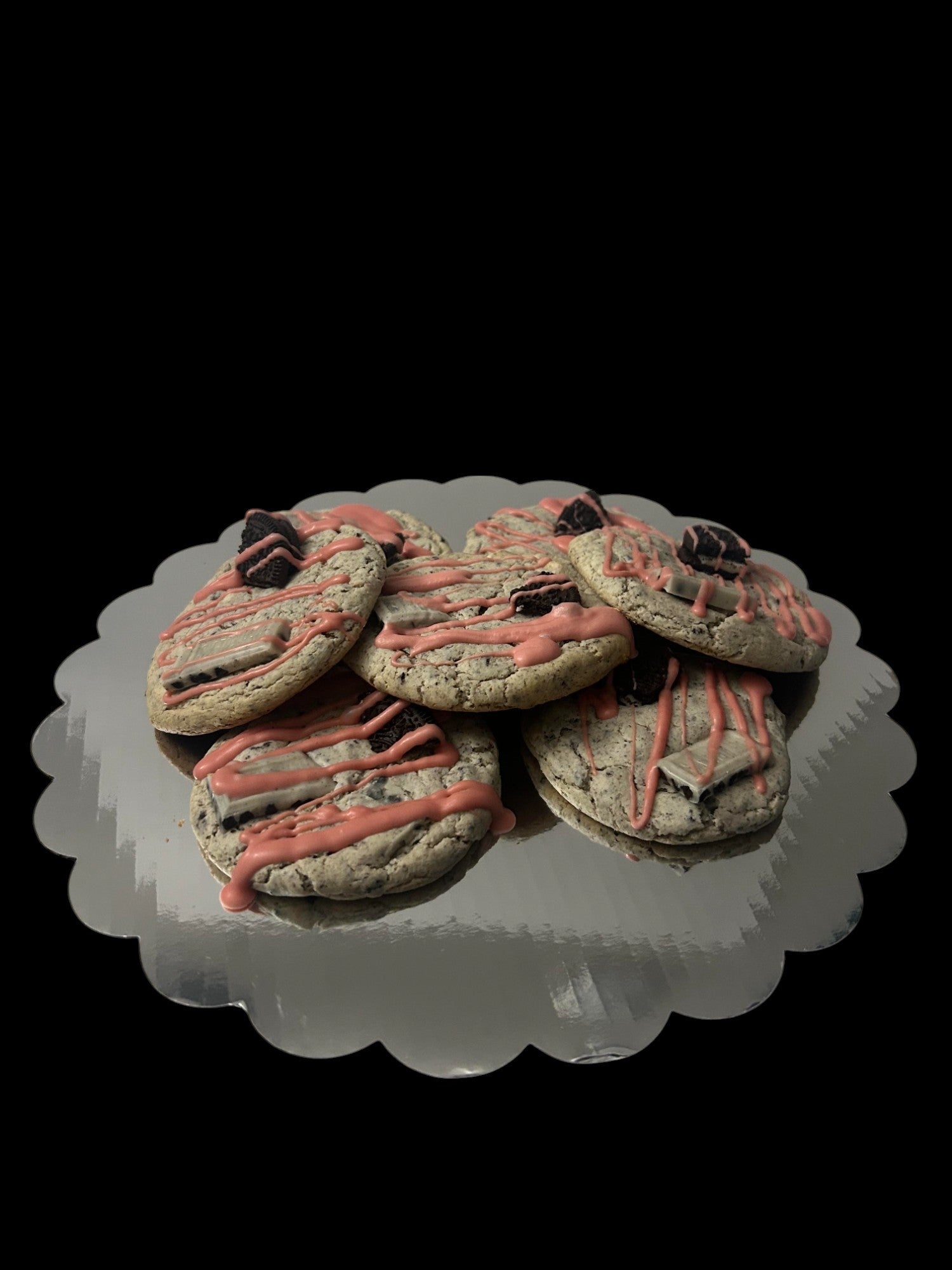 This cookie is a delightful twist on your regular cookie. Our cookies and cream cookie contains crushed oreos, crushed cookies and cream hershey bars and white chocolate chips. This results in a cookie that is both crispy on the edges and soft in the center with a delightful crunch from the Oreos. This cookie is also topped with a strawberry chocolate drizzle.